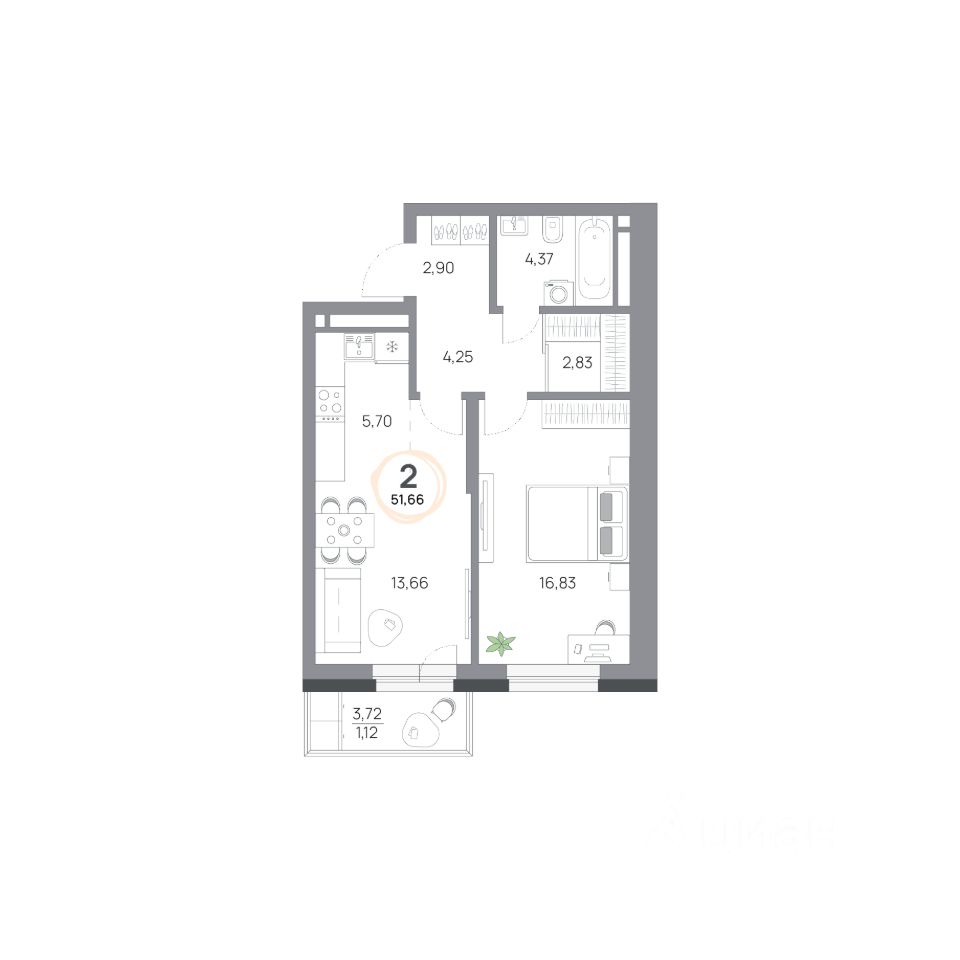 2-комнатная квартира, 51.66кв.м., 4 этаж