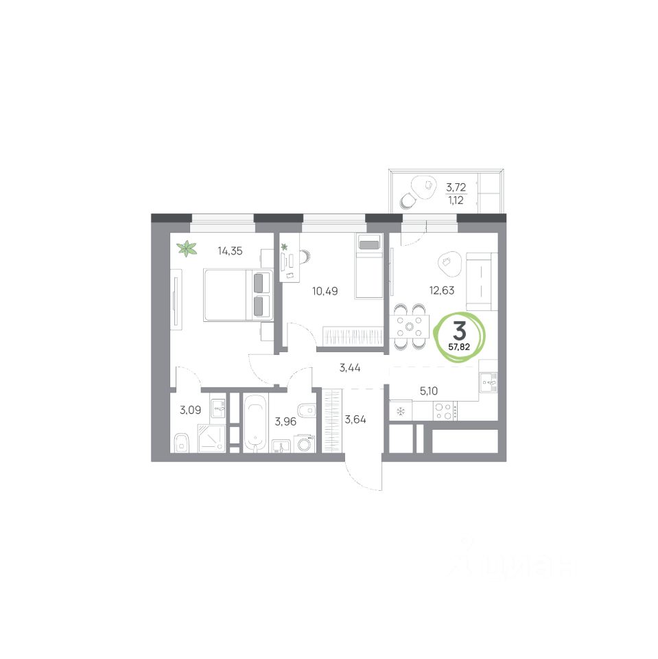 3-комнатная квартира, 57.82кв.м., 3 этаж