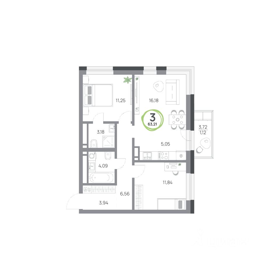 3-комнатная квартира, 63.21кв.м., 7 этаж