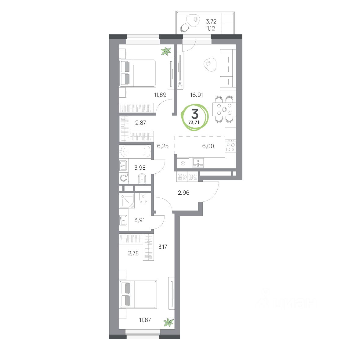 3-комнатная квартира, 73.71кв.м., 4 этаж