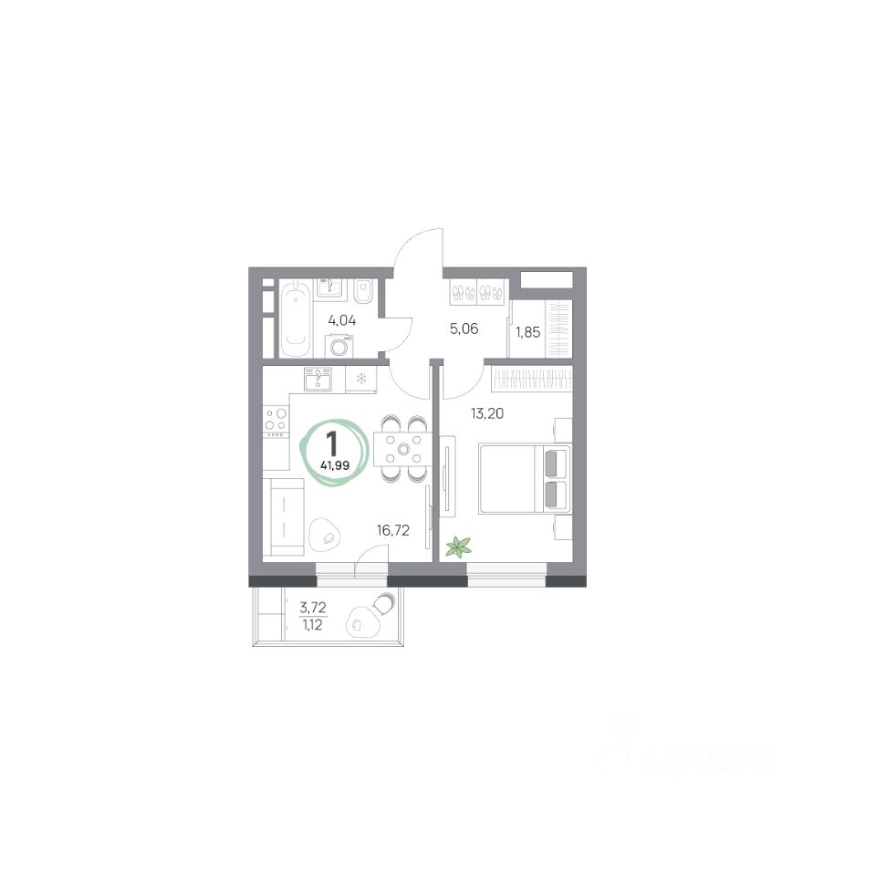 1-комнатная квартира, 41.99кв.м., 2 этаж