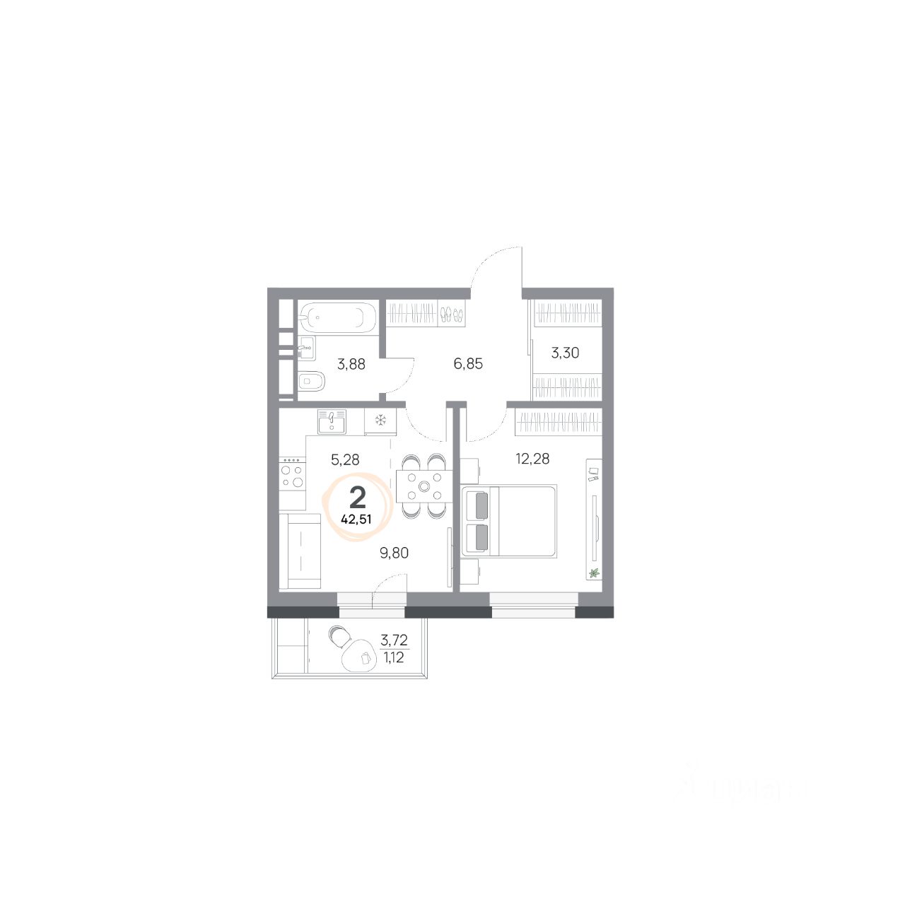 2-комнатная квартира, 42.51кв.м., 4 этаж