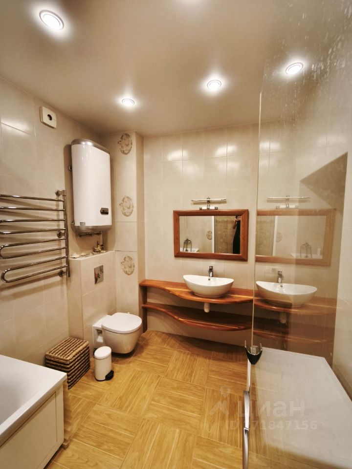 В ванной пол с подогревом. Душевая кабина просторная, ванная, унитаз, раковина-чаша на деревянной столешне (массив), натяжной потолок. Площадь 8 кв.м.